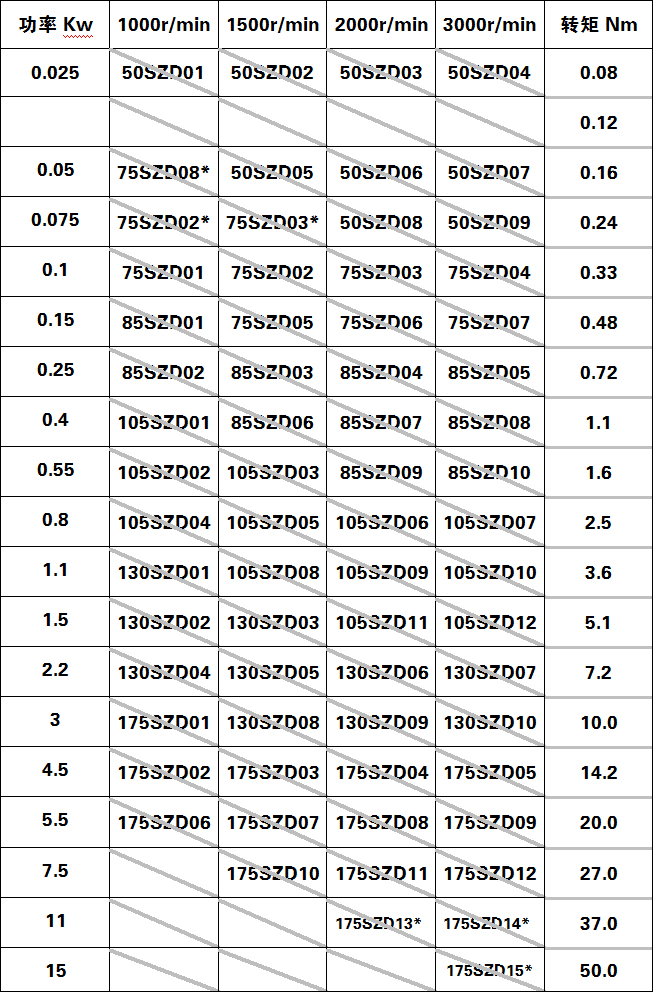 有刷伺服電機選型速查表